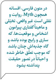 در متون فارسی، افسانه همچون Myth، روایت و نقلی است غیر واقعی، تخیّلی و ماهیتاً گفتاری، پیرامون اشخاص و موقعیتها که ساری و رایج بوده باشد و گاه جذبهاش چنان باشد که موجب تعلّق خاطر شده و احیاناً در تصور حقیقت پنداشته بشود: